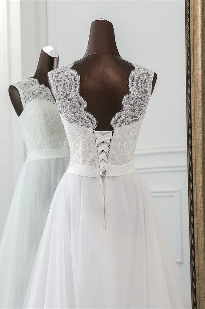 Elegant A line wedding dress featuring a jewel neck and lace appliques. Made from tulle, this sleeveless floor length gown is perfect for the modern bride. The dress is available in various sizes and colors.