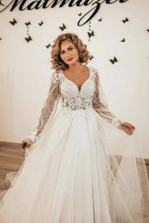 Fall head over heels for this A line wedding dress, featuring a sweetheart neckline and long sleeves, perfect for any season. Exquisite lace appliques adorn the tulle fabric, adding a touch of romance and sophistication. The floor length hemline and sweep brush train ensure you’ll glide gracefully down the aisle. With a flattering silhouette and delicate embellishments, this dress is a dream come true to make your special day even more magical.