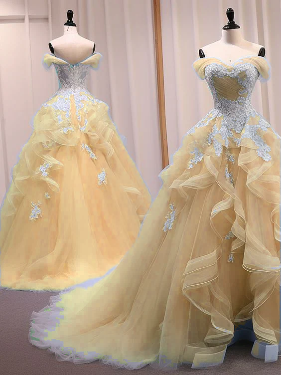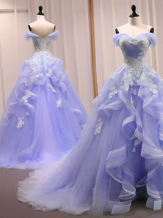 This beautiful A line prom dress features a sweetheart neck and off-shoulder design, perfect for making a stunning entrance. The long, flowing tulle lace adds a touch of elegance, while the blue color gives it a sophisticated look. The dress is ideal for formal events, such as proms or weddings, and is sure to make you feel like a princess. With its comfortable fit and beautiful design, this dress is a must-have for any formal occasion.