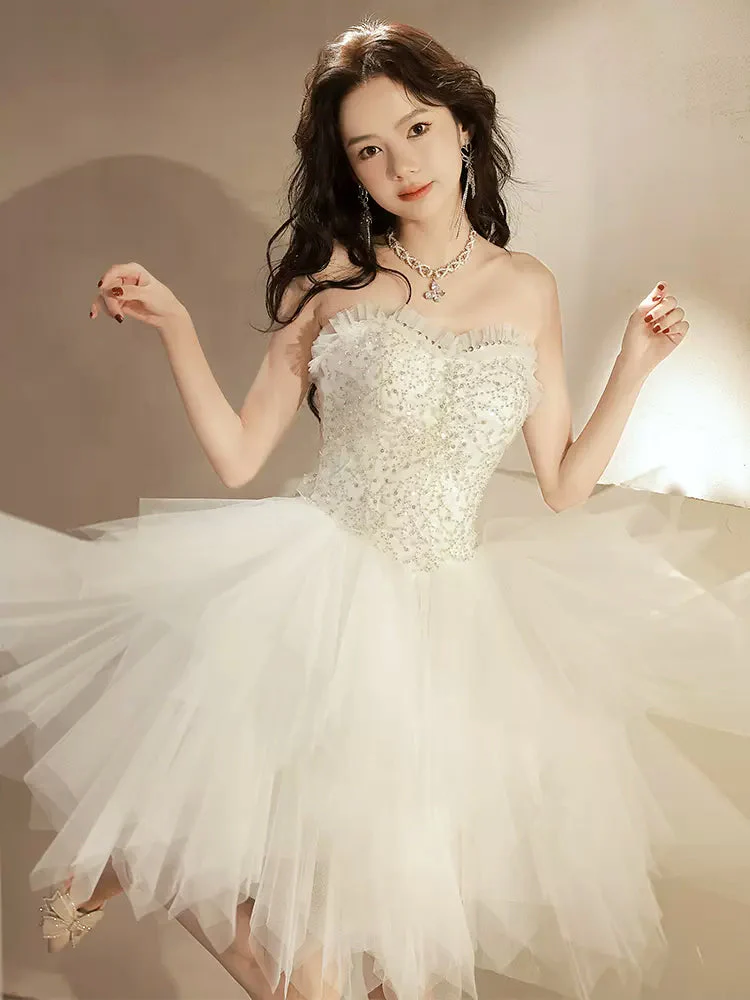 White Tulle Sequin Short Prom Dress White Homecoming Dress