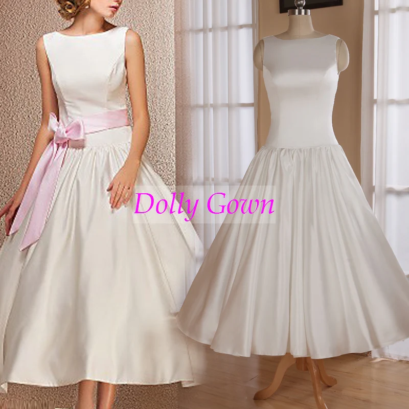 Klassieke satijnen, op de jaren 1950 geïnspireerde trouwjurk met bateau-hals, theelengte.