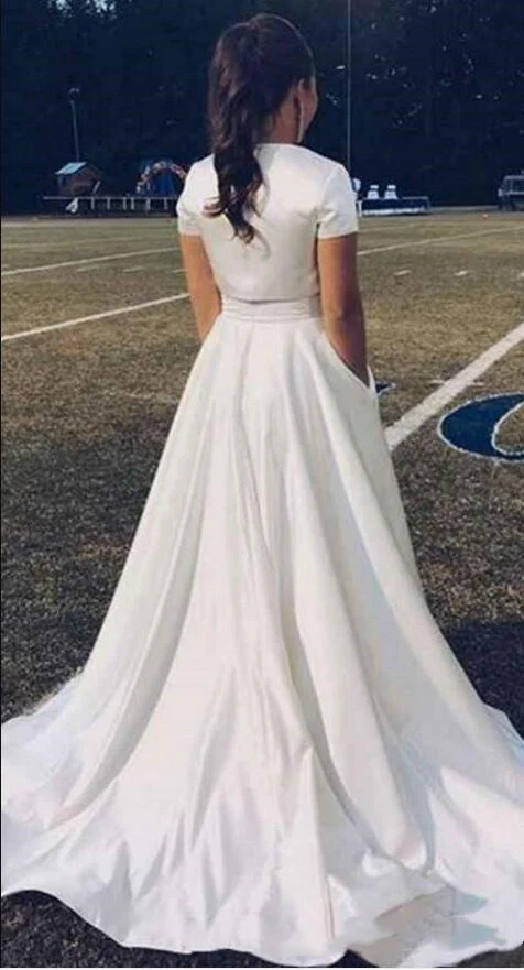 Met juweelhals, korte mouwen, eenvoudige satijnen tweedelige trouwjurk