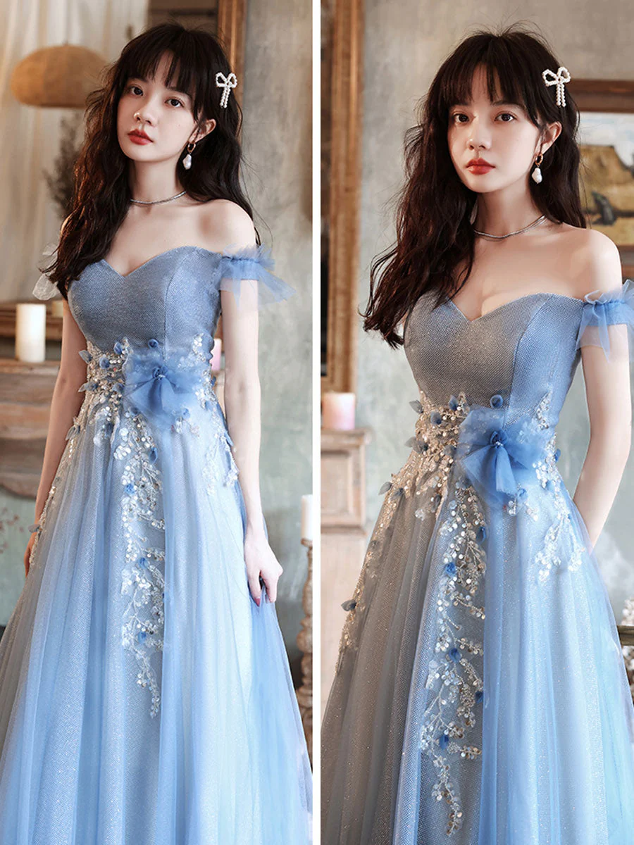 Fall in love with this gorgeous blue off shoulder tulle long prom dress, featuring a sweetheart neckline and delicate beading details. The perfect dress for any formal occasion, this beautiful gown is sure to turn heads with its floor length silhouette and lace up back. With a built-in bra and custom color options available, you can make this dress truly yours. Whether you’re attending a prom this stunning blue tulle dress is the perfect choice.
