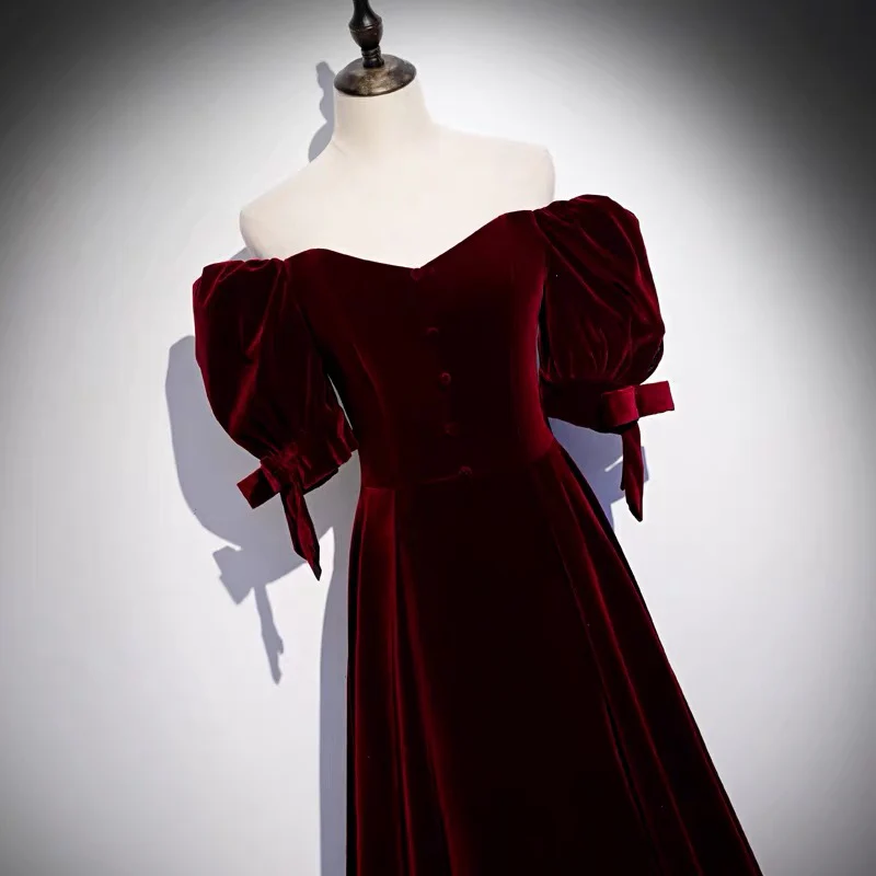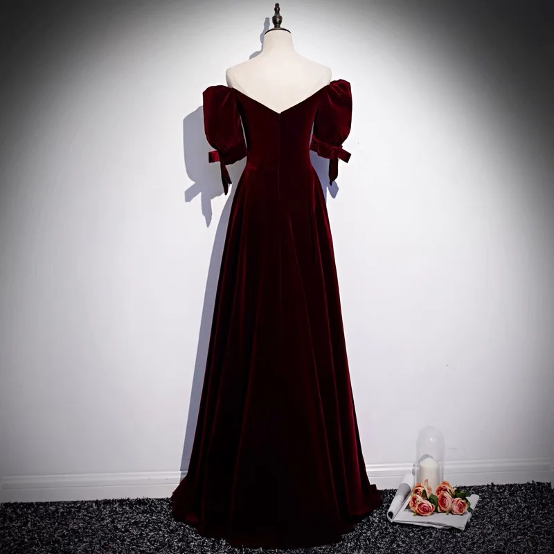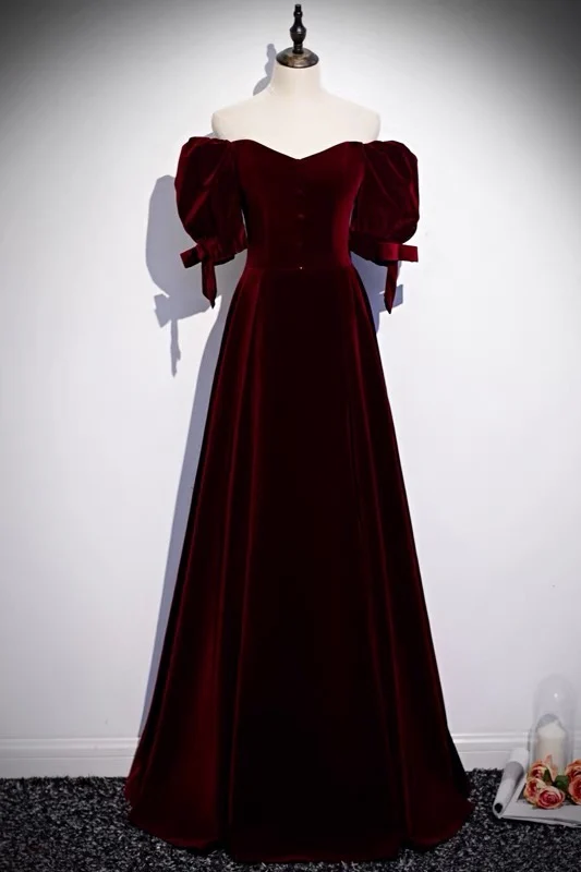 Off-the-shoulder bladerdeeg bandjes mouw A-lijn fluwelen lange galajurk