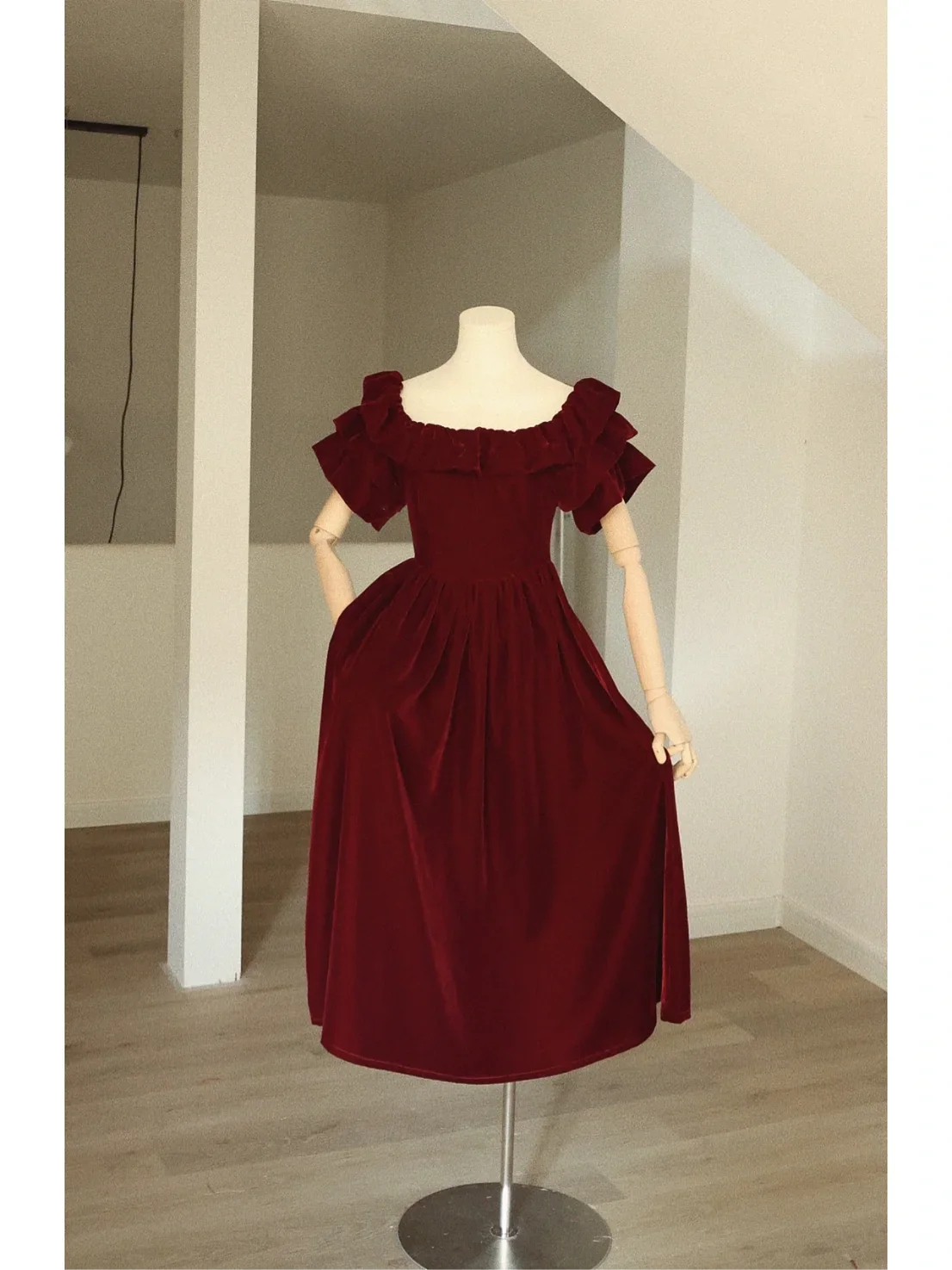 Bordeaux fluwelen vintage jurk met ronde hals