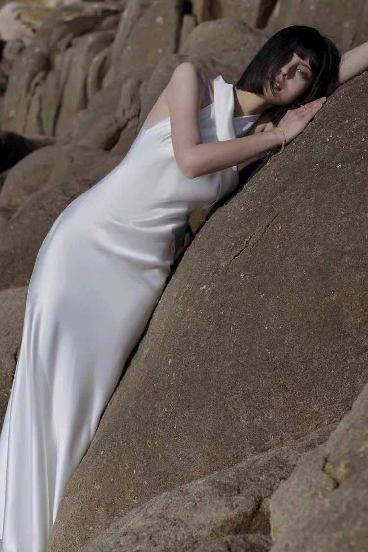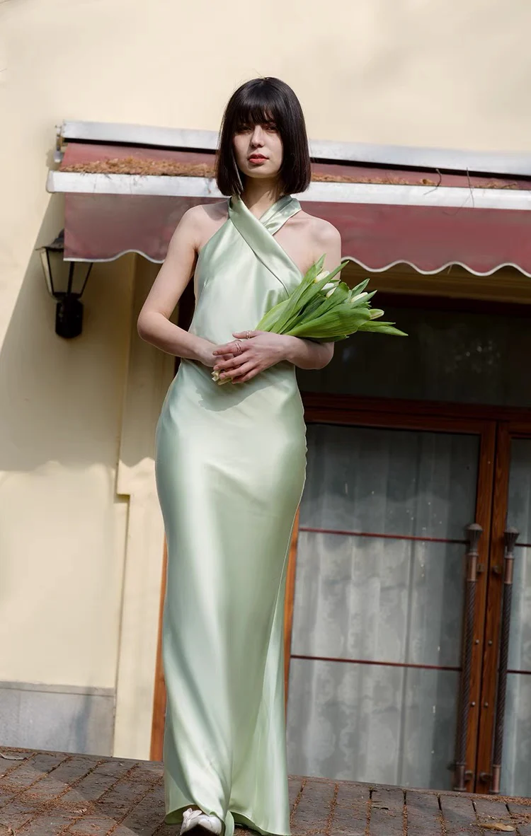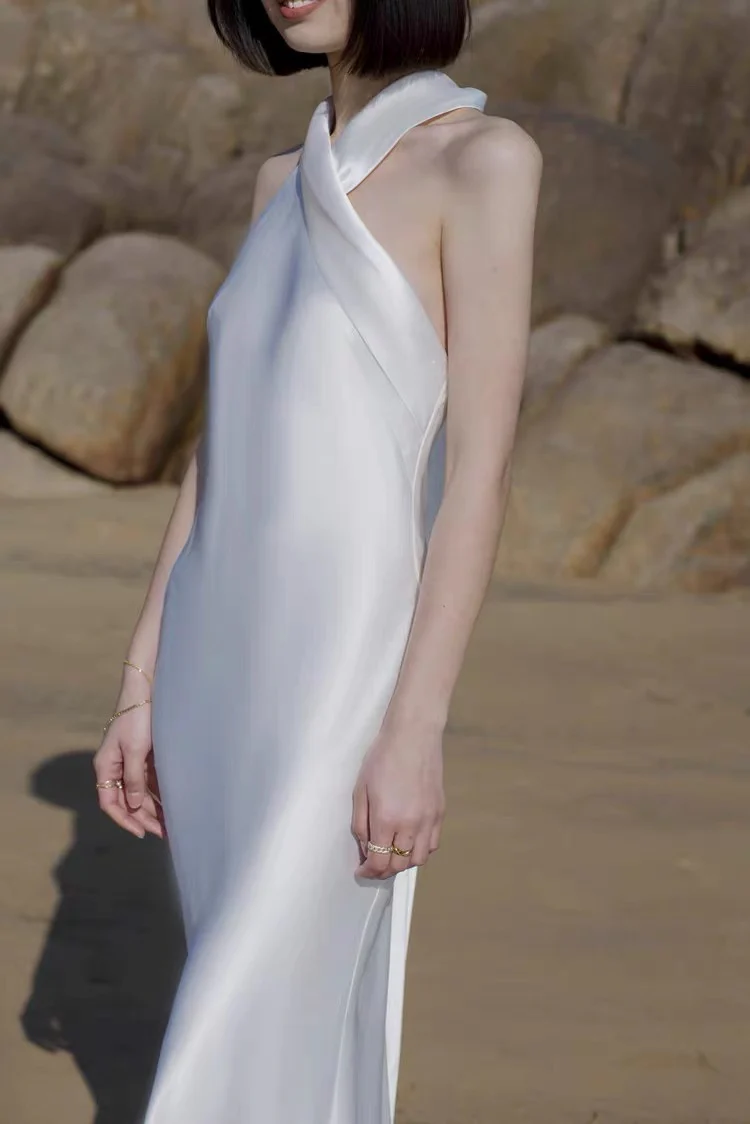 Eenvoudige halterhals slip zijden schede strand trouwjurk