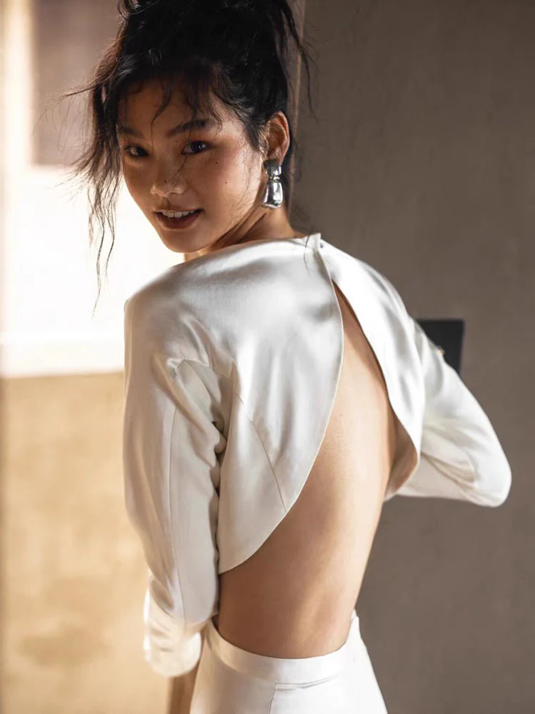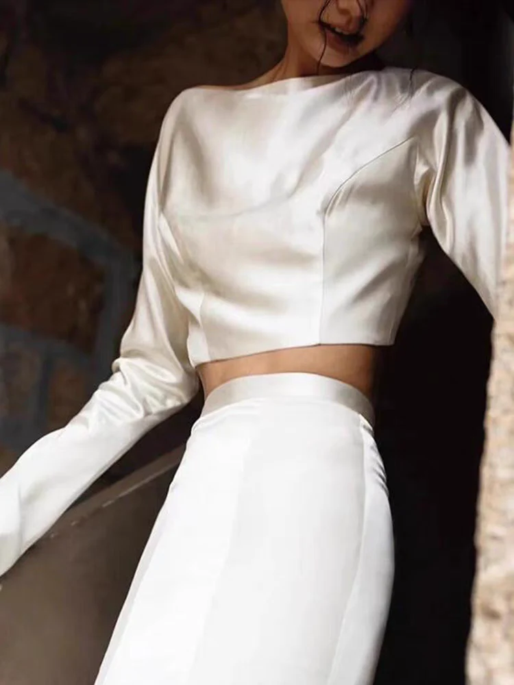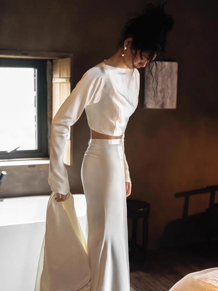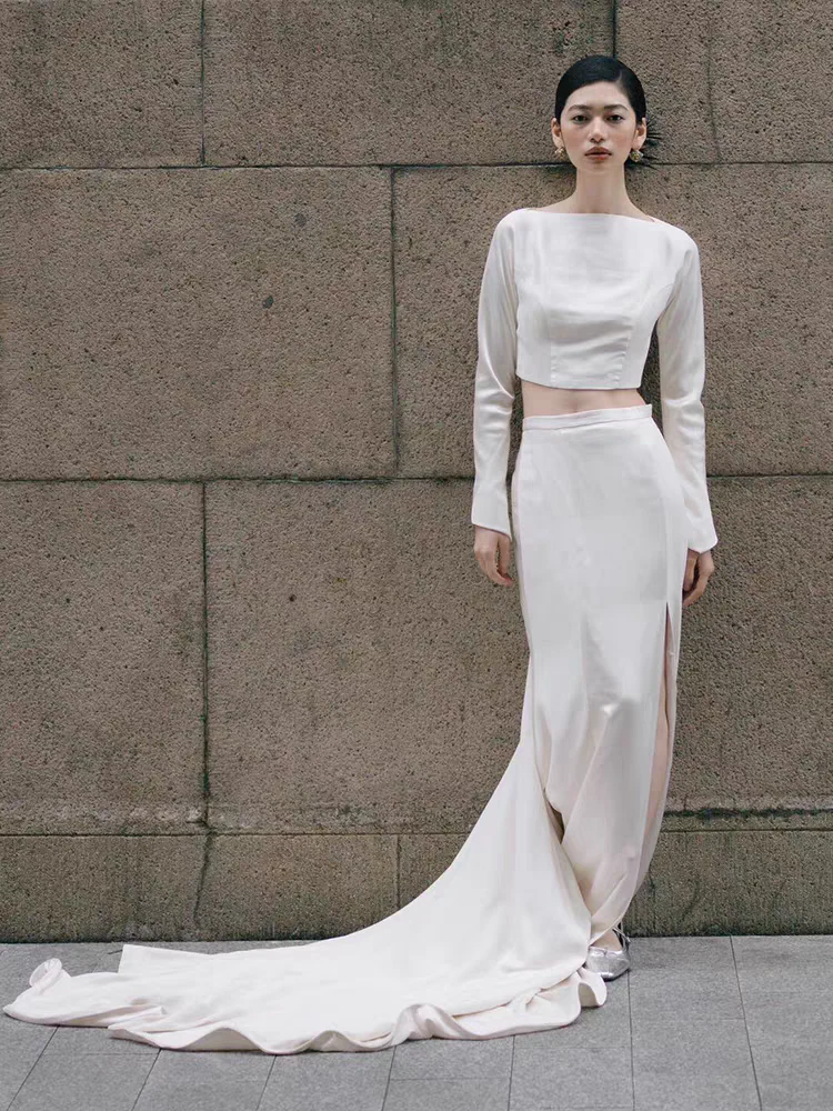 This casual two piece wedding dress is crafted from 100% silk material, offering a modern and relaxed bridal look. Featuring a long sleeve top paired with a sleek skirt, it combines comfort with elegance. The side slit adds a hint of allure and movement, making it perfect for brides who want effortless sophistication with a contemporary twist.