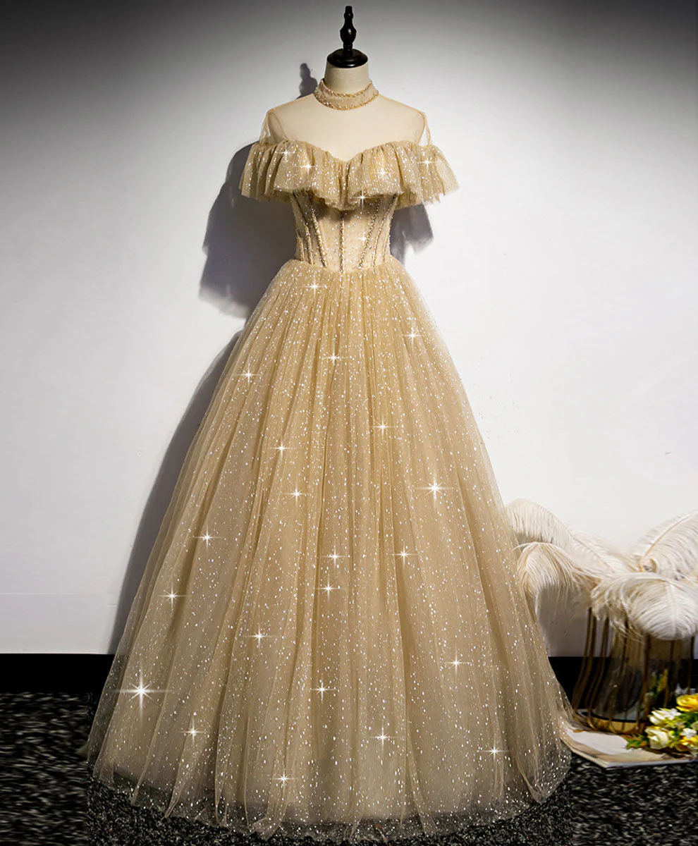 This champagne long prom dress is truly a showstopper, with its tulle fabric and sequin details that shine like diamonds in the light. The A line silhouette and high neckline create a flattering and sophisticated look. Perfect for prom, weddings, or any other formal occasion, this dress is sure to turn heads. With its floor length design and built in bra, you’ll feel confident and beautiful all night long. Whether you’re looking for a classic and elegant look or a more modern and trendy style, this dress is sure to impress.