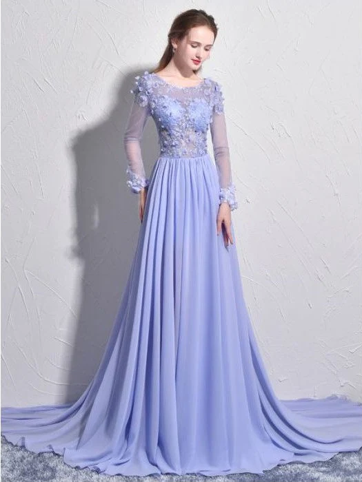 Lila doorschijnend kanten lijfje met lange mouwen, A-lijn kapelsleep chiffon galajurk met accent met 3D kanten appliqué