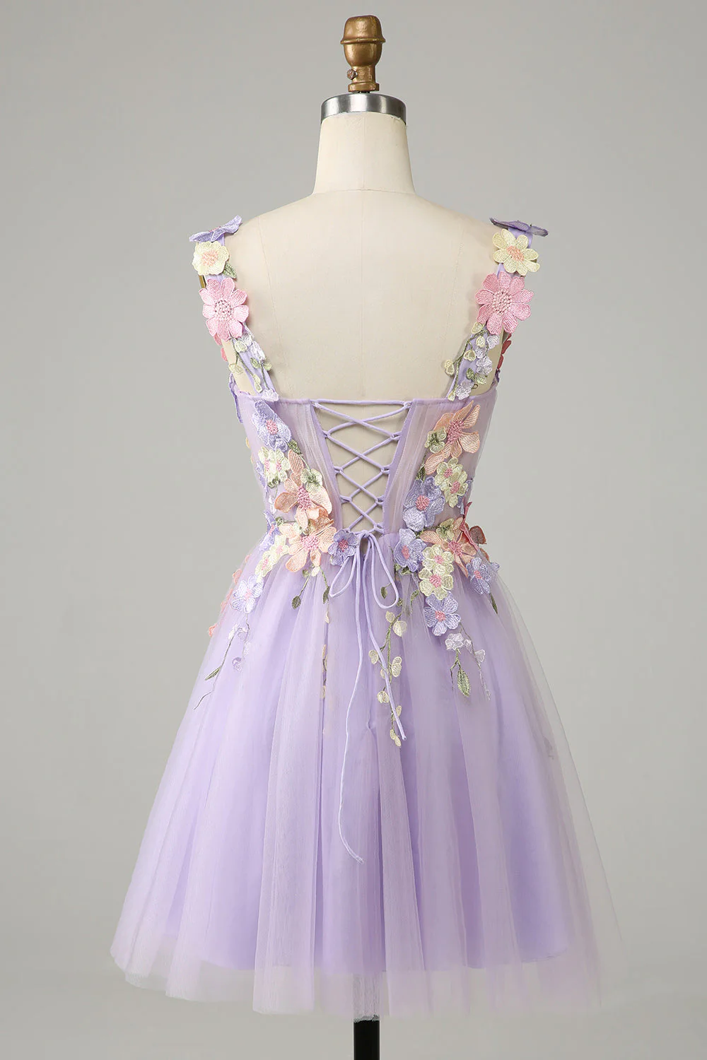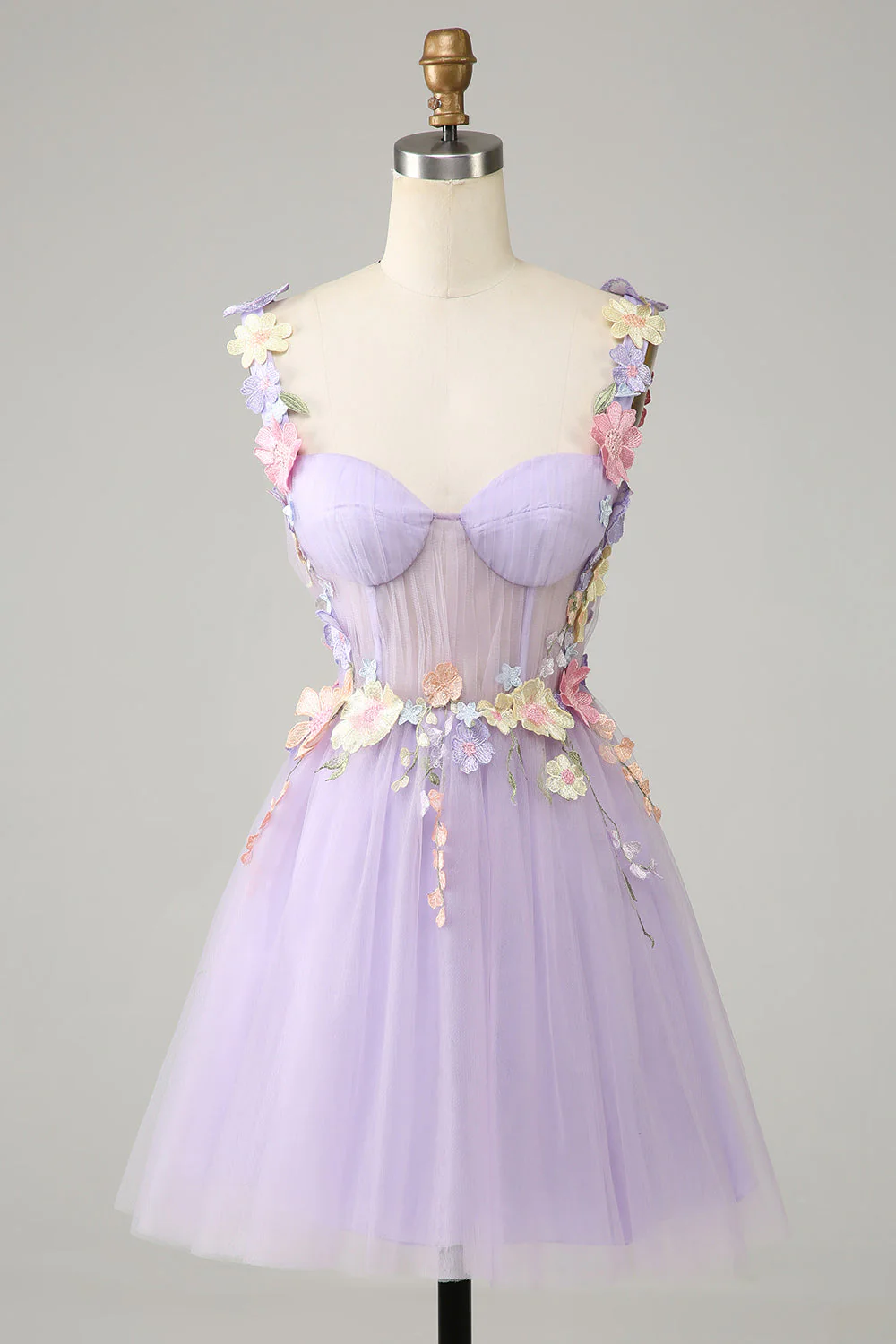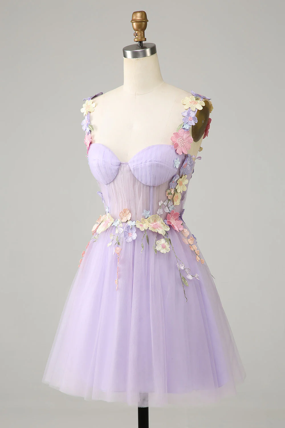 Sparkle and stun in this 3D Floral Sweetheart Lace-Up Homecoming Dress! The sheer bodice and delicate 3D floral lace make you the star of the dance, while the A-line cut and lace-up back create a figure-flattering silhouette. Perfect for homecoming or any other dance, this short party dress will make you feel confident and beautiful all night long!