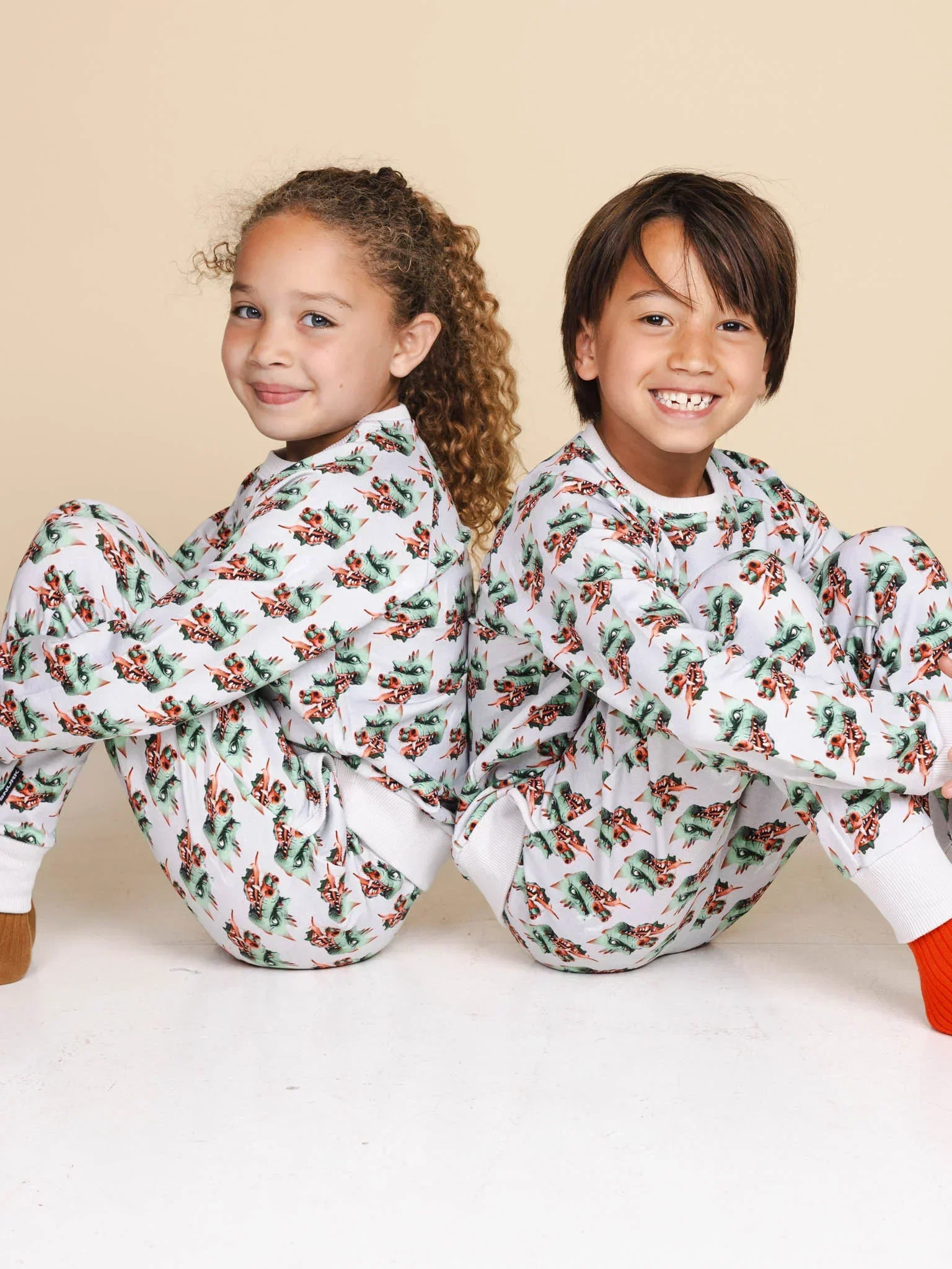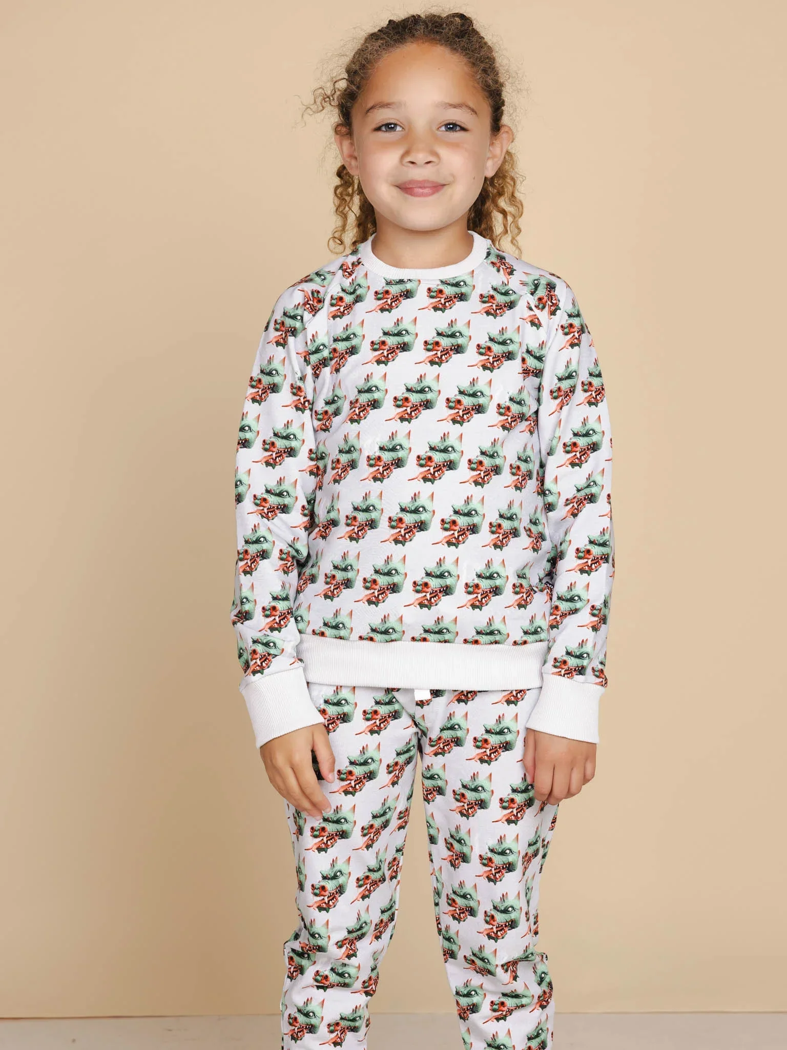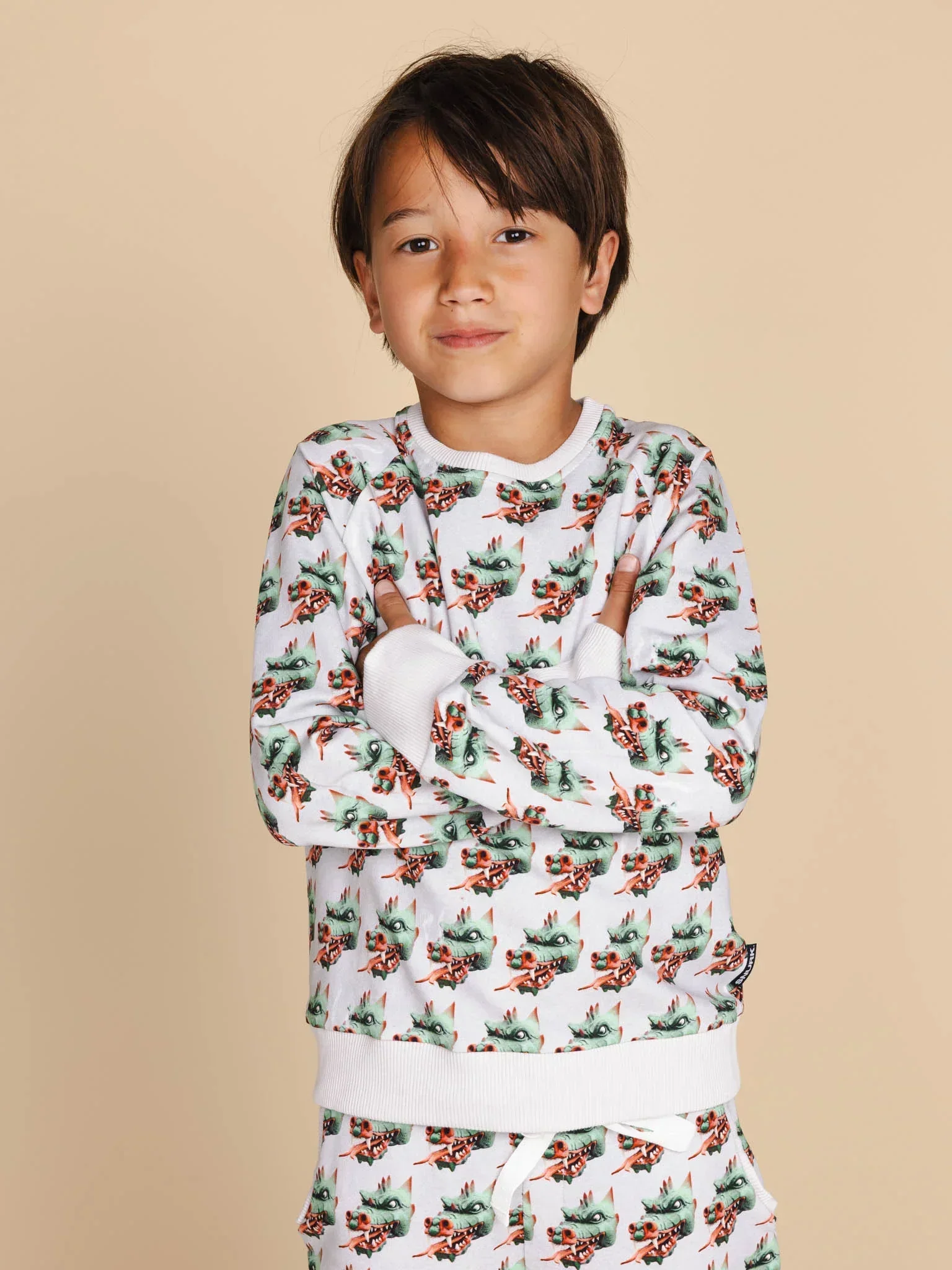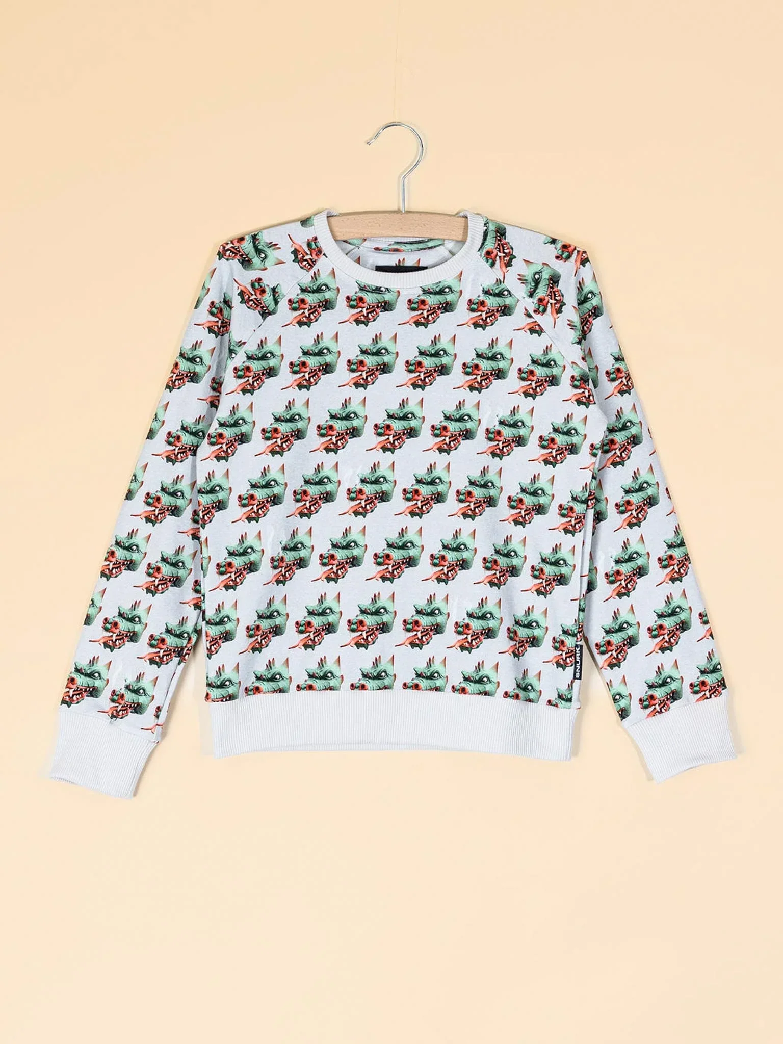 Deze legendarische schatbewaker uit het Sprookjesbos houdt alles scherp in de gaten. Zijn kop loert vanuit alle hoeken op het lichtgrijze biologische katoen. Zacht, comfy en een tikje gevaarlijk. Komt daar een klein woest wolkje uit z’n neus?