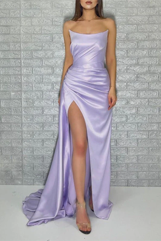 Twirl into enchantment with this stunning lavender mermaid prom dress. Its strapless, sleeveless design and graceful high split ensure you’ll captivate every eye in the room. Crafted for comfort and style, this gown offers a perfect blend of modern elegance and whimsical charm. Prepare for a night of unforgettable moments and endless compliments.