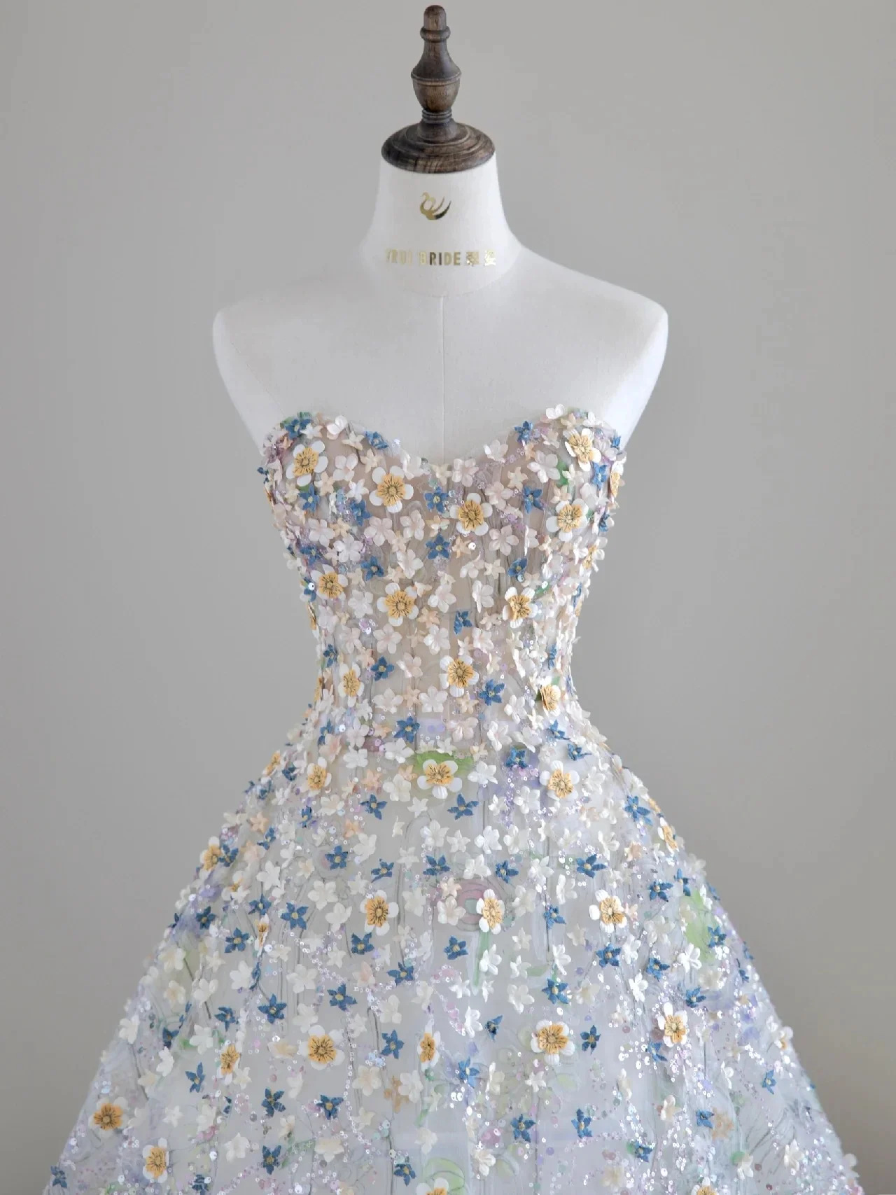 The Floral Ball Gown Formal Prom Dress is a breathtaking ensemble that combines elegance and femininity. This exquisite gown features delicate 3D-florals scatter all over the dress.. The strapless sweetheart neckline accentuates the shoulders and collarbone.this dress is perfect for proms or any formal occasion where you want to make a memorable and enchanting entrance.
