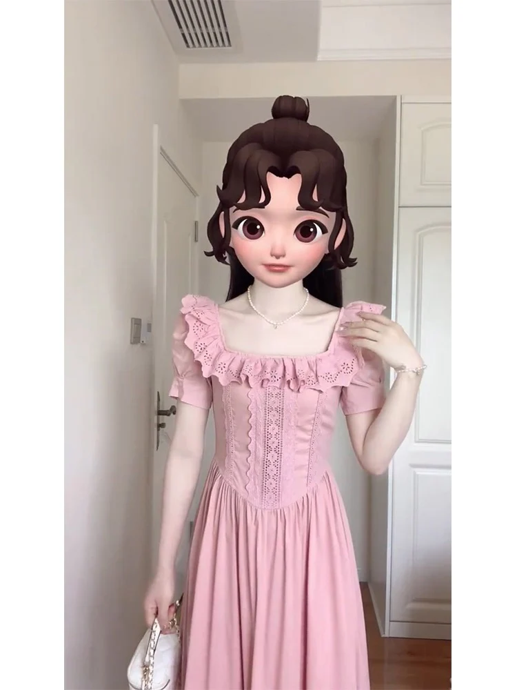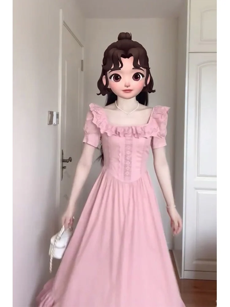 Franse stijl blozen roze vierkante hals vintage jurk