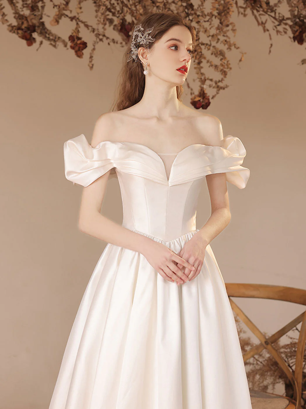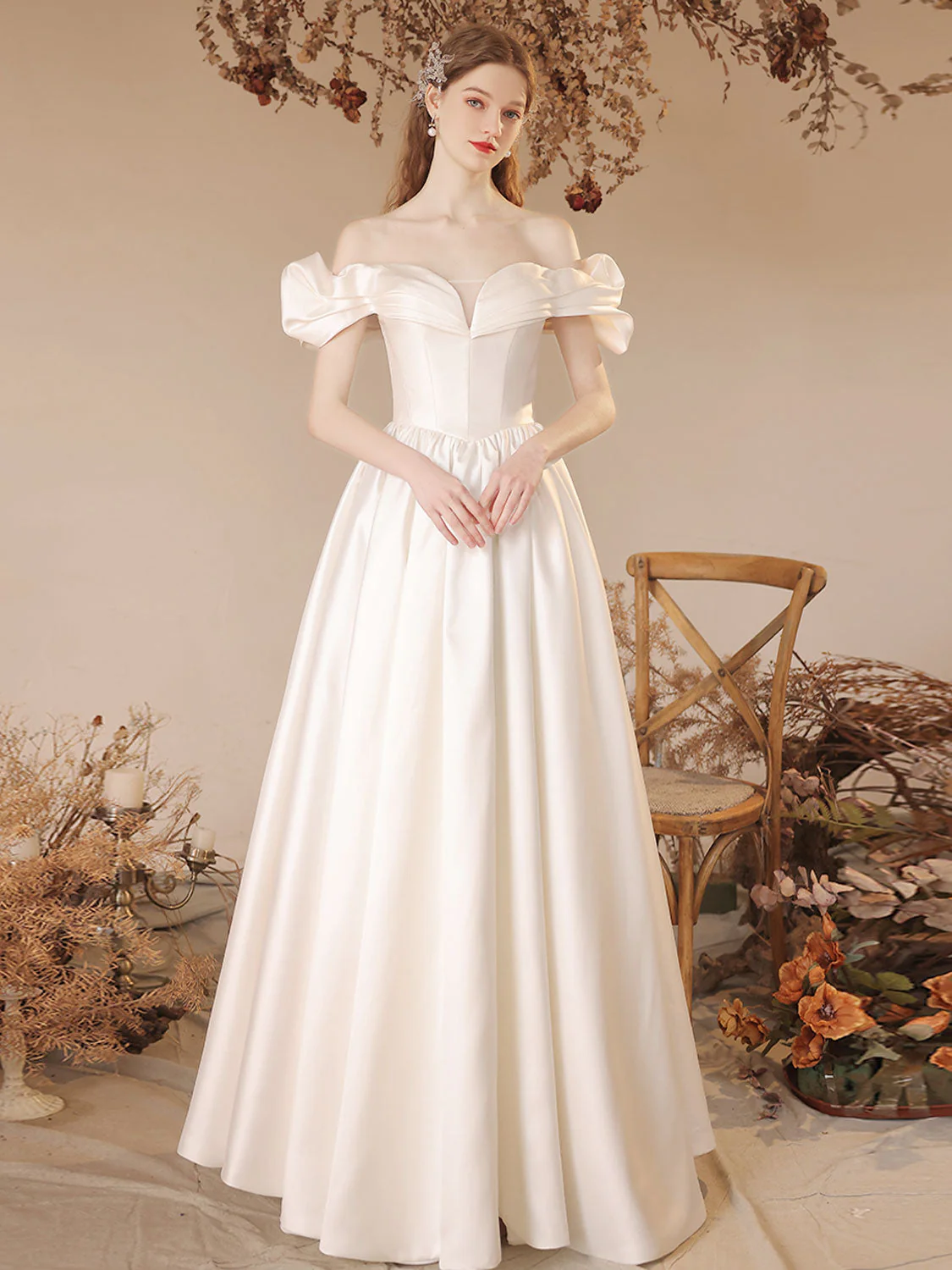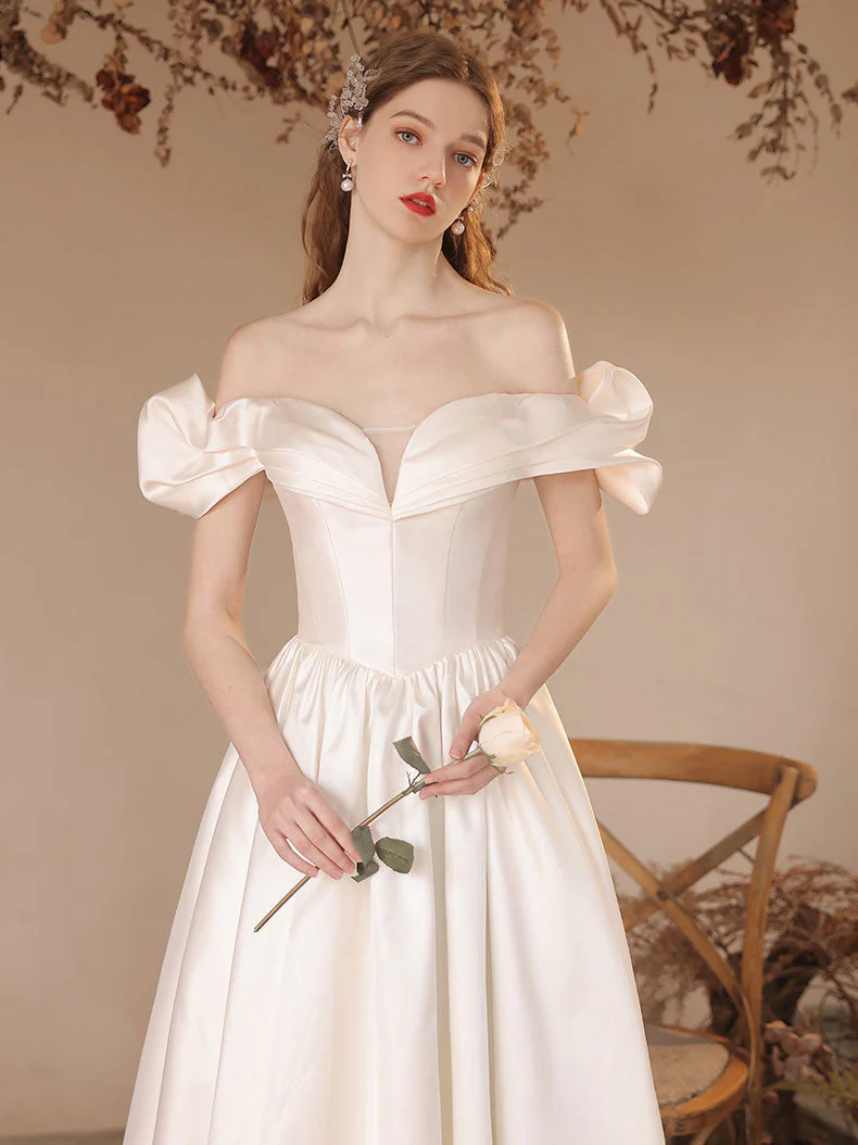 A-lijn off-shoulder satijn beige lange galajurk, beige formele avondjurk