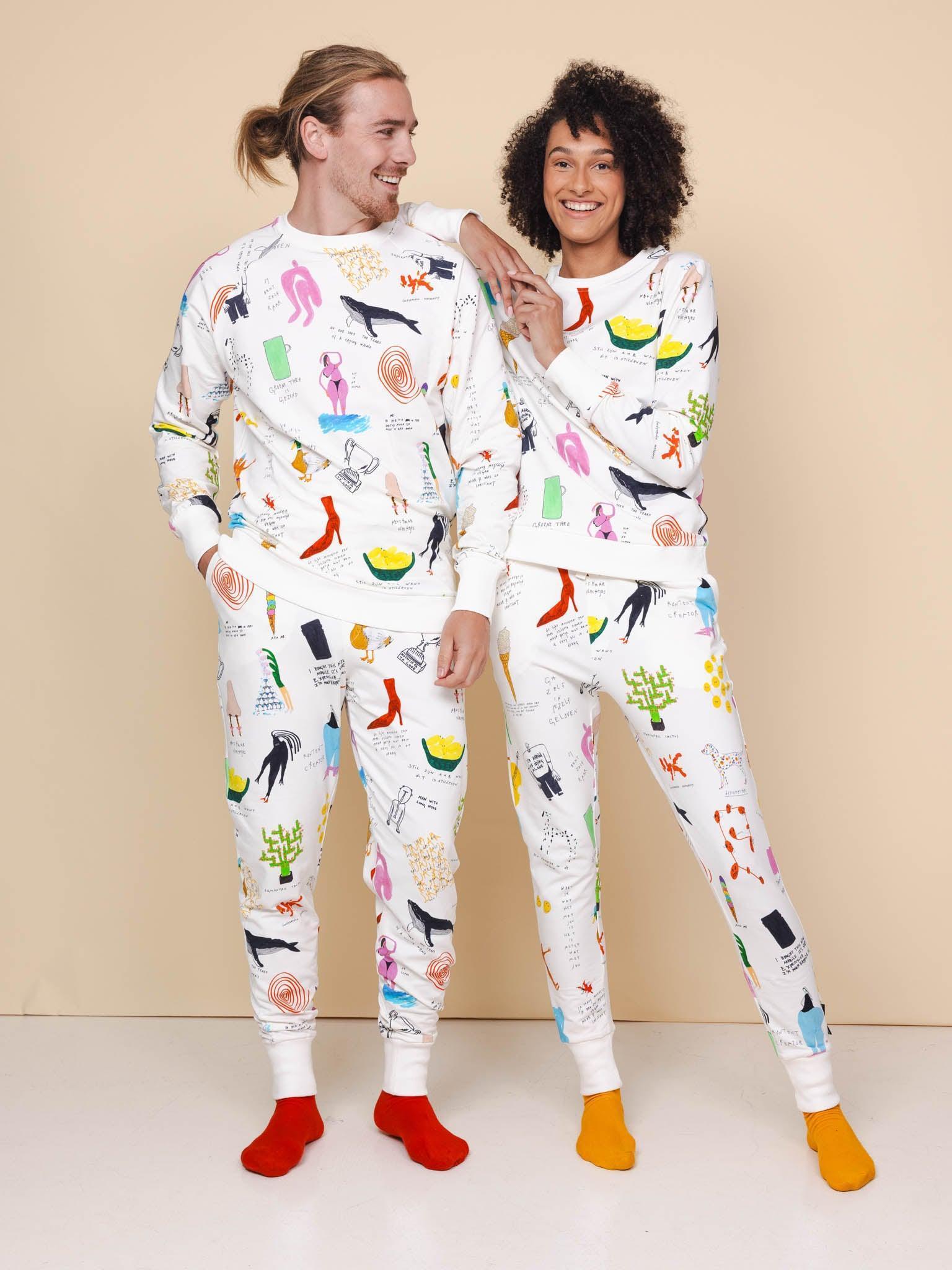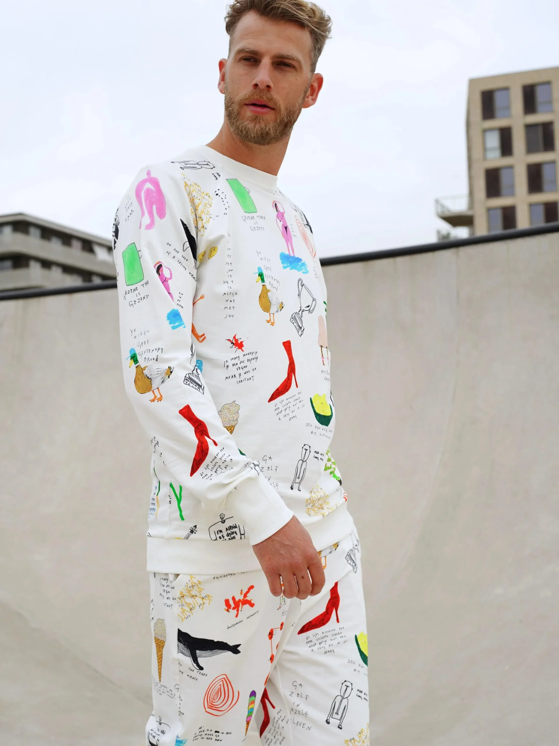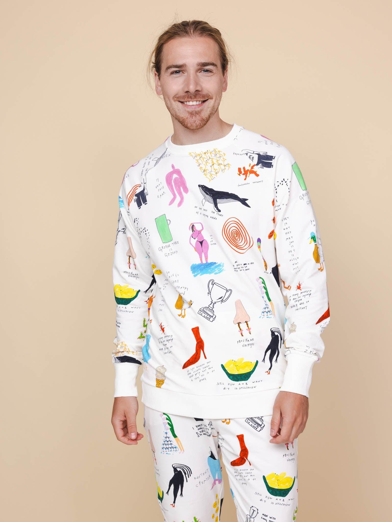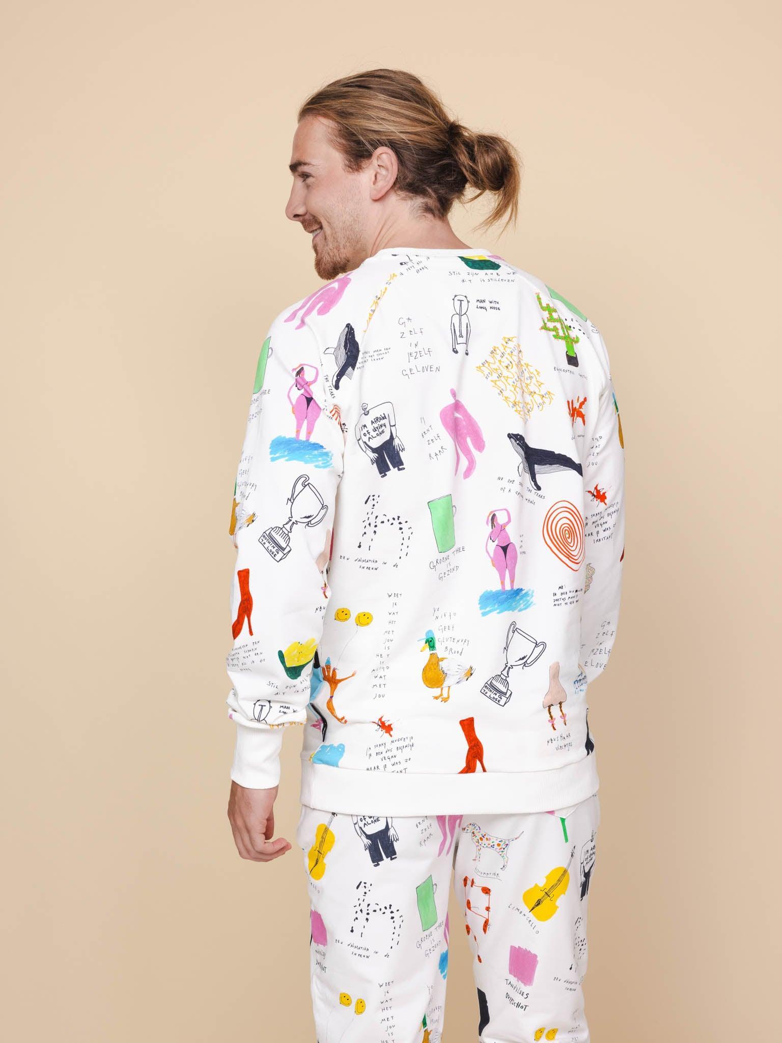 Heren sweater en broek met fotoprint gemaakt van 95% biologisch katoen, 5% elastaan.