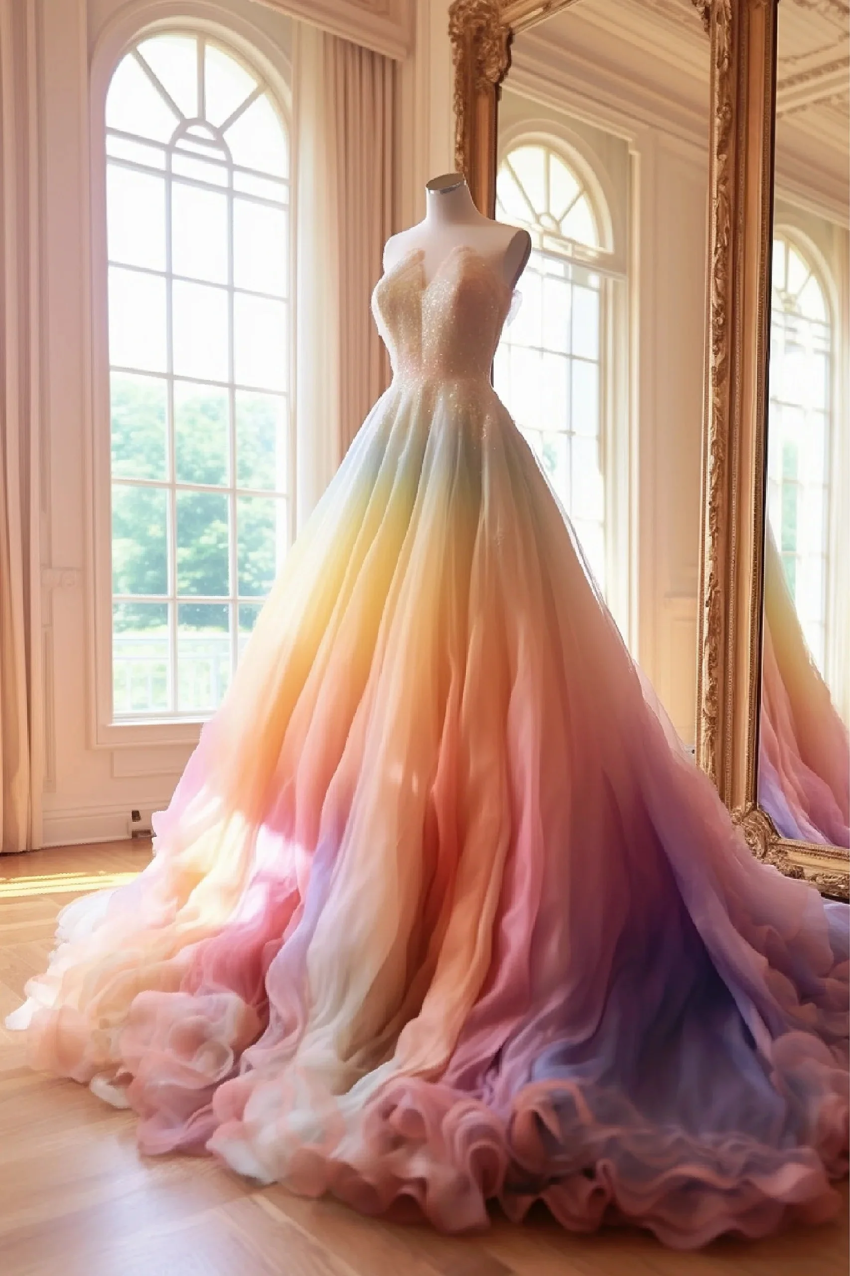 The Romantic Dip Dye Rainbow Colored Wedding Dress is a captivating and unique gown that embraces the beauty of color. With its dip dye technique, the dress showcases a gradient of enchanting rainbow hues, creating a mesmerizing and ethereal effect.