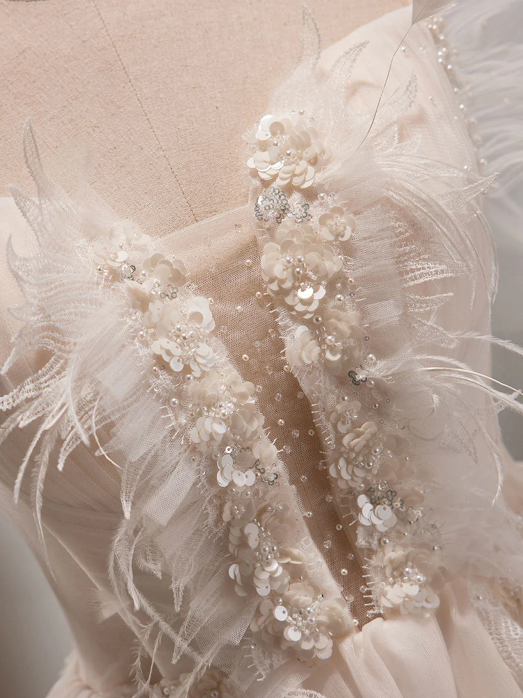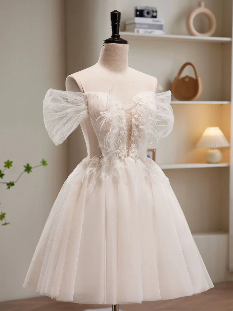 A-lijn off-shoulder tule korte beige galajurk, schattige homecoming-jurk