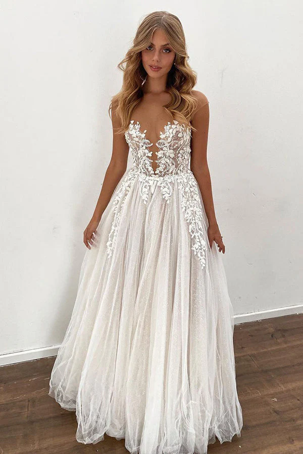 Say ‘yes’ to the dress that will have everyone talking! Our Sheer A Line Wedding Dress is the perfect balance of ethereal and chic. Delicate tulle appliques cascade down the floor length gown, creating a romantic and unforgettable look. With a jewel neckline and a sweep/brush train, you’ll float down the aisle with grace and style. Featuring a zipper back and built in bra for comfort and support, this dress is made to order for your perfect fit.