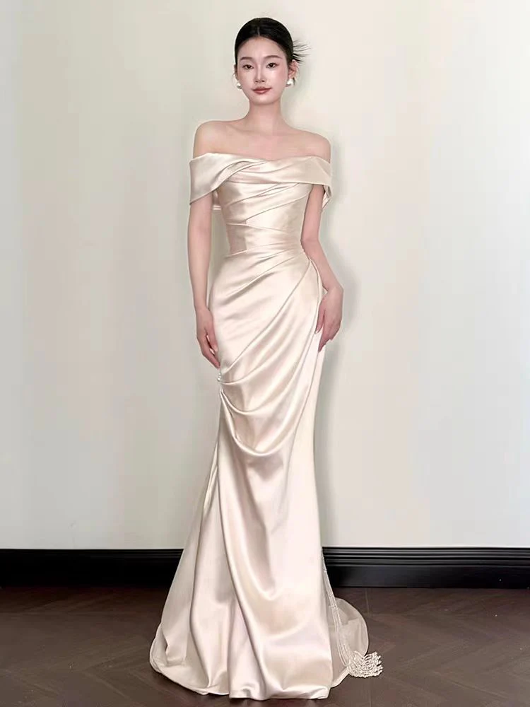This simple off the shoulder wedding dress is crafted from luxurious 100% silk satin, featuring an elegant asymmetrical neckline and hem. Its minimalist design and soft, flowing silhouette create a timeless, modern bridal look with effortless sophistication.