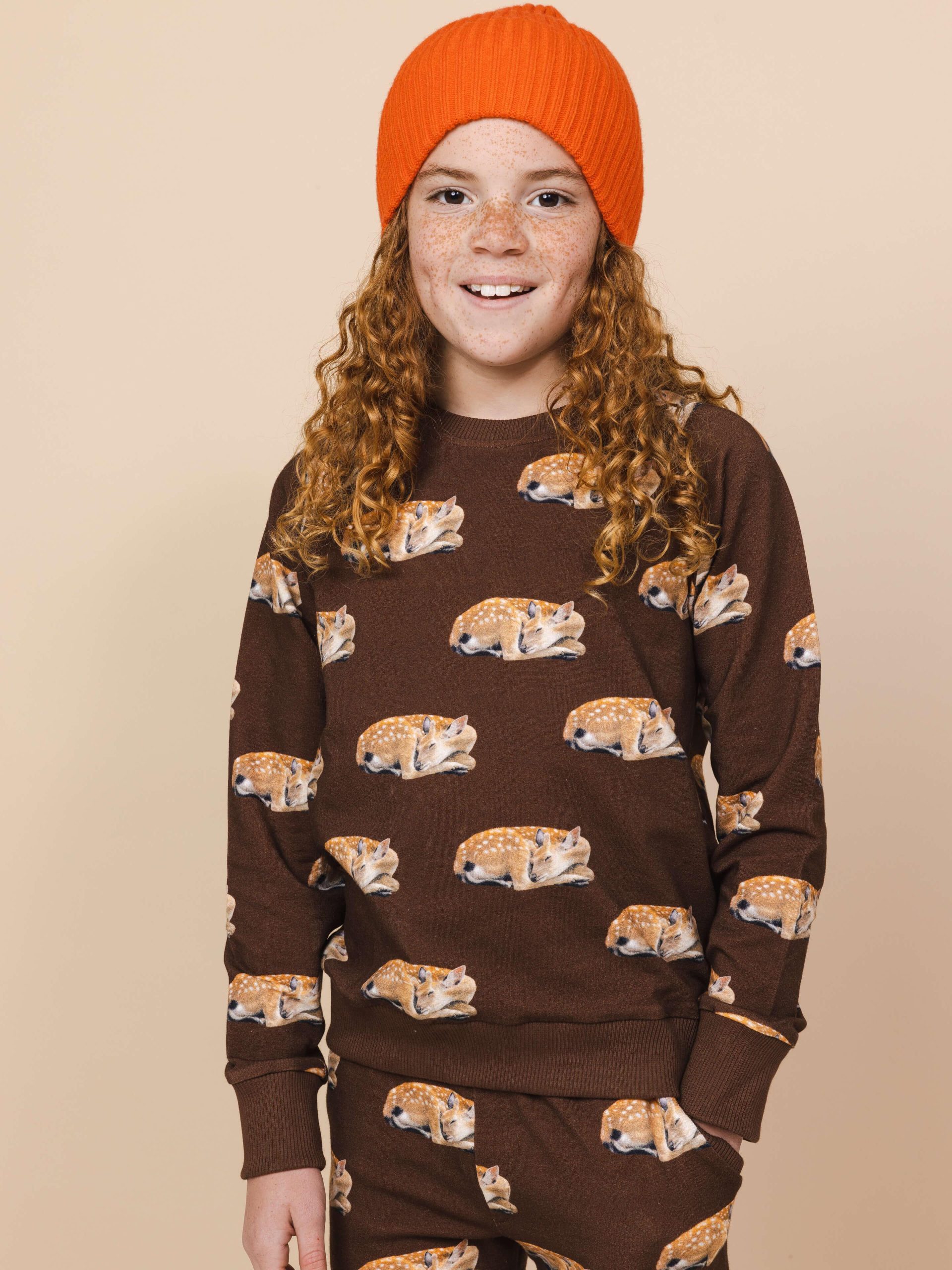 Dit lieve slapende hertje op je kleding brengt je in sprookjesachtige sferen. Kruip gezellig bij elkaar en geniet samen in ons zachte biologische katoen.