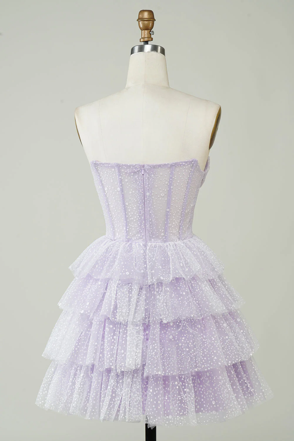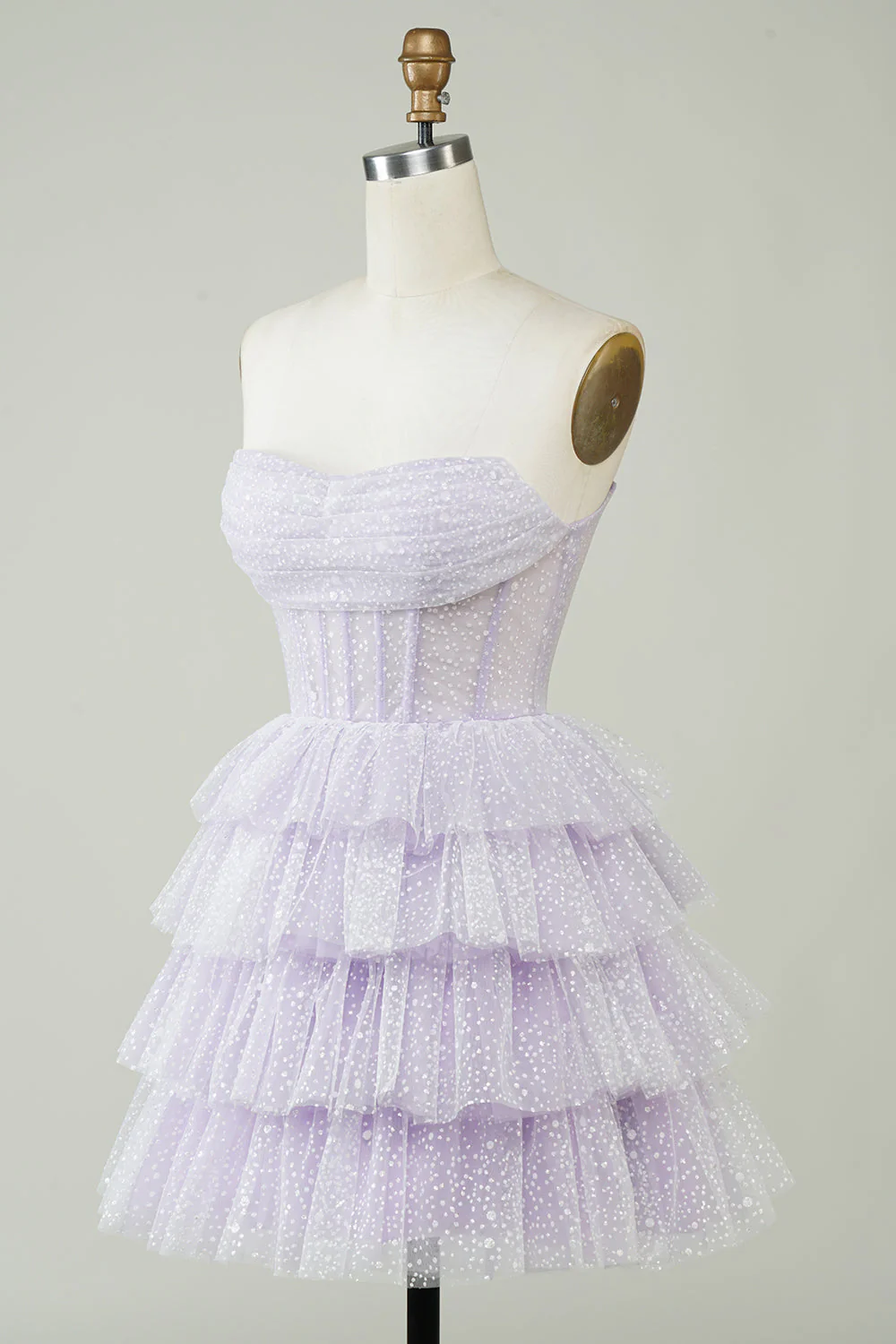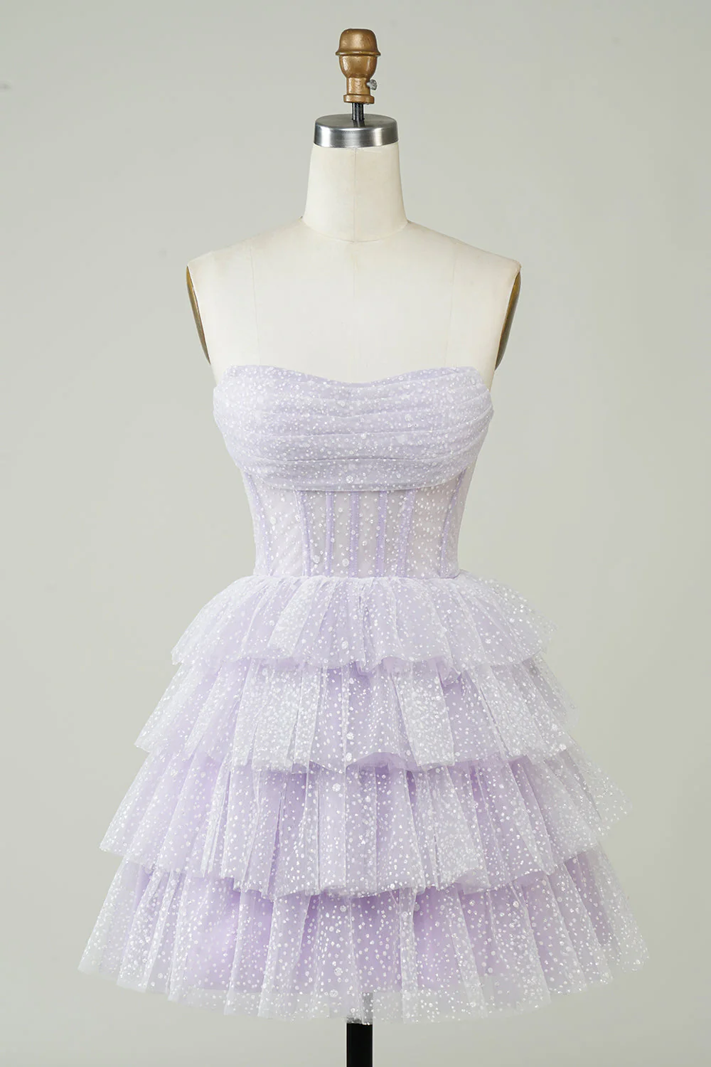 Make a grand entrance at your next special event with this sparkly purple corset homecoming dress. This strapless, tiered mini gown is perfect for parties and dances, with a flattering corset bodice and playful layered skirt. You’ll feel confident and radiant all night long. Embrace the sparkle and dance the night away in this dazzling dress!