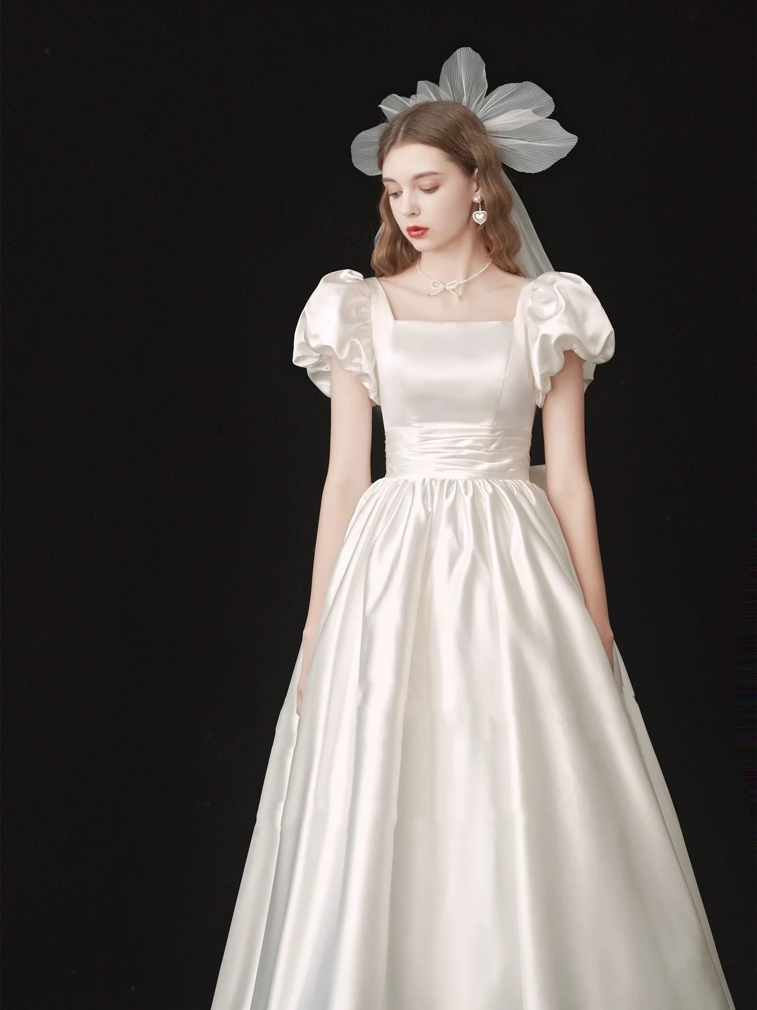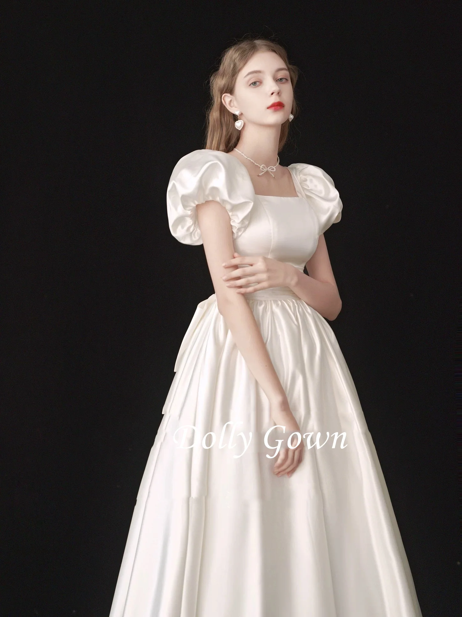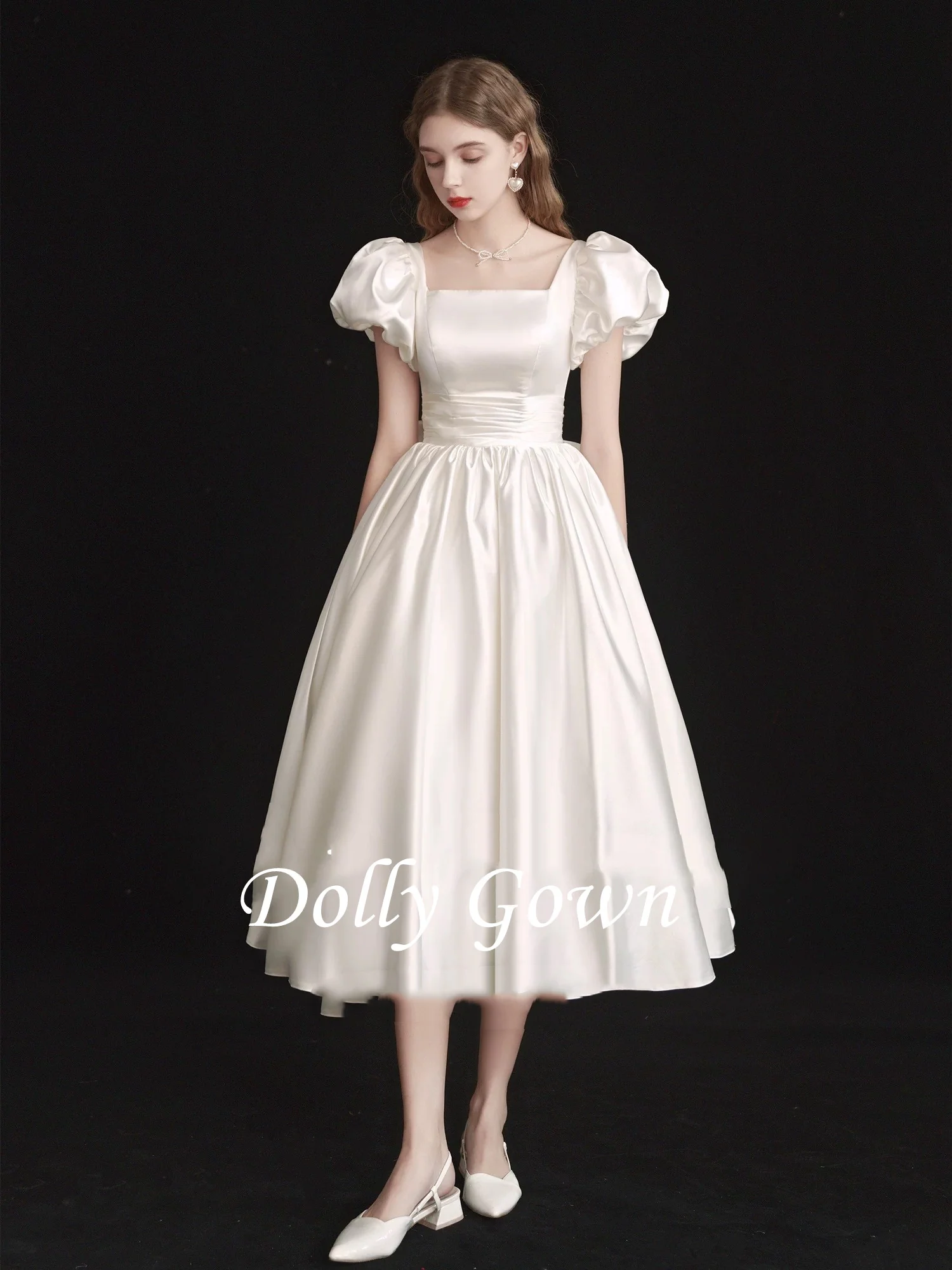Vintage inspired Tea Length Satin Bridal Gown Features Square Neckline and Bubble Sleeves