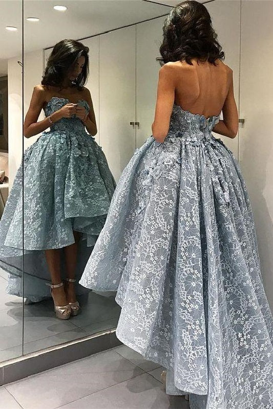 Strapless stoffige blauwe hoge lage kant cocktailjurk galajurk