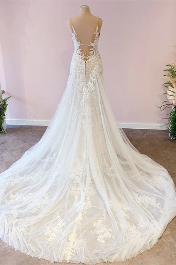 Say ‘yes’ to this dress and prepare to float down the aisle in our A-line wedding dress. It has delicate spaghetti straps, a sweetheart neckline, and exquisite lace appliques. The tulle fabric creates a dreamy silhouette, ensuring you’ll look radiant and feel comfortable on your special day. Get ready to make unforgettable memories in this ethereal masterpiece!