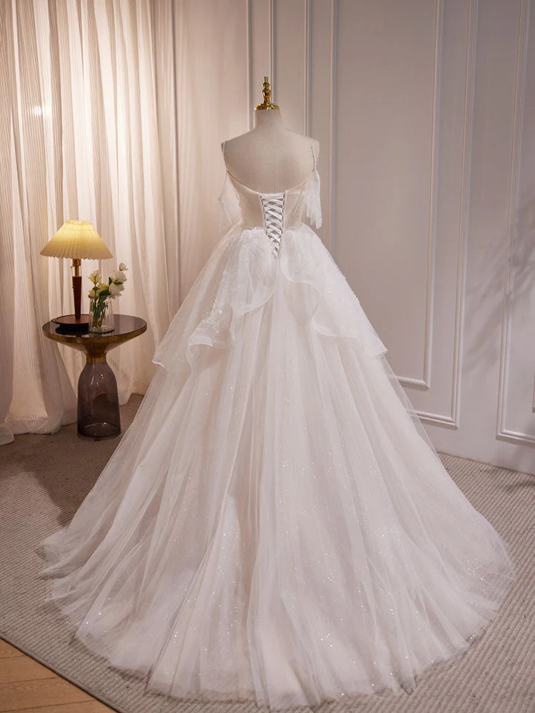 White A-line Tulle Beading Long Prom Dress, Beige Formal Dress