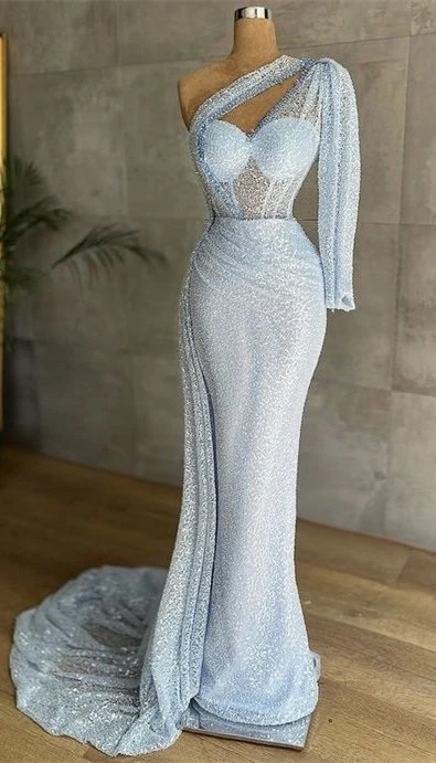 Doorzichtige zeemeermin-galajurk met één schouder en lange mouwen