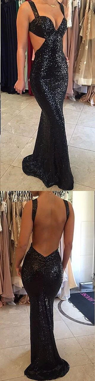 Sexy zwarte pailletten backless zeemeermin lange galajurk