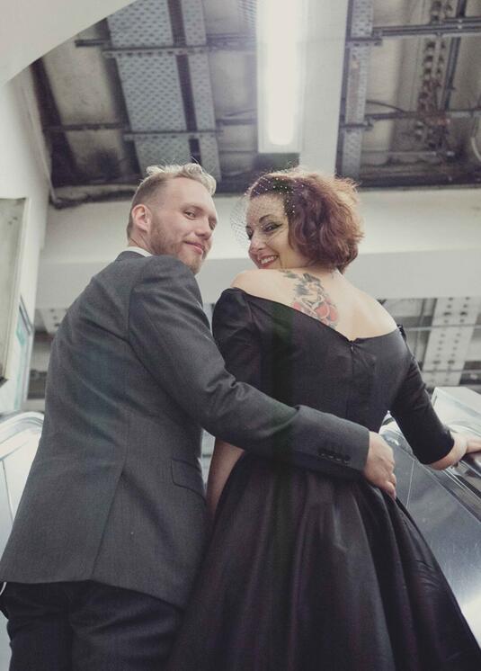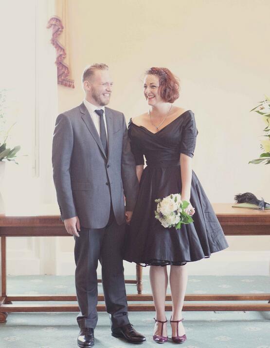 Korte mouw uit de schouder Audrey Hepburn geïnspireerd korte zwarte trouwjurk